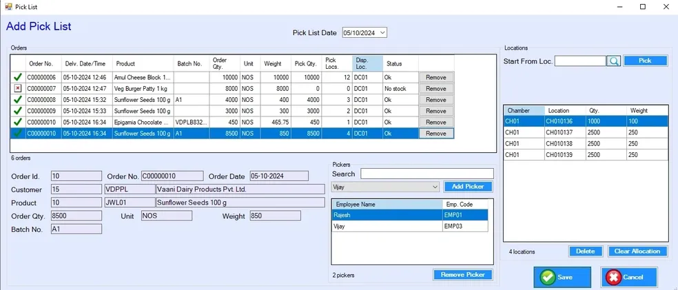 Users can select the delivery date, and the system automatically fetches all orders scheduled for that date. It allocates locations for picking based on Batch Number or stock out methods like FIFO (First In, First Out), FEFO (First Expiry, First Out), and LIFO (Last In, First Out). Users can then select available pickers, and the system divides the locations among them, optimizing the workload distribution.